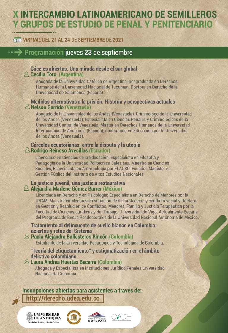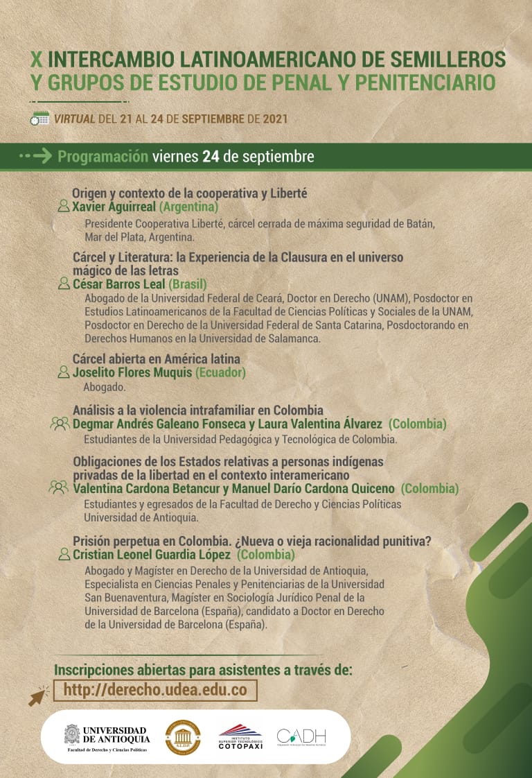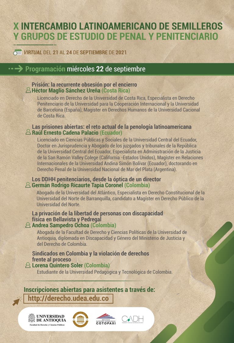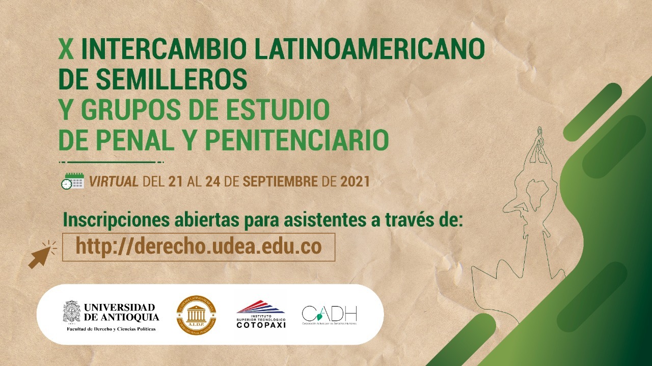 X Intercambio Latinoamericano de Semilleros y grupos de estudio de penal y penitenciario Publicado por Juan David Posada Segura el agosto 5, 2021 Inscripciones abiertas UdeaA X Intercambio latinoamericano de semilleros y grupos de estudio de penal y penitenciario (udea.edu.co) Comparte esto: Haz clic para compartir en Facebook (Se abre en una ventana nueva) Facebook Haz clic para compartir en X (Se abre en una ventana nueva) X Me gusta Cargando... Relacionado