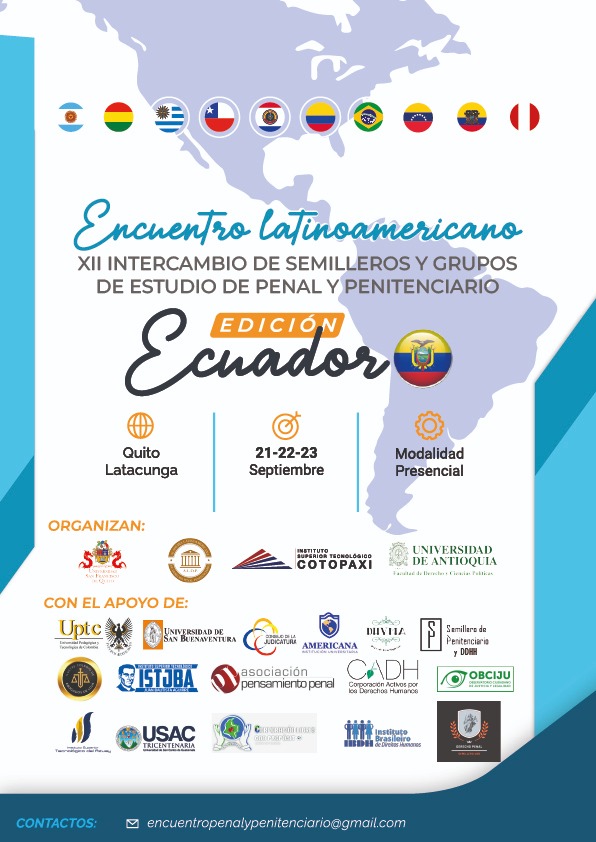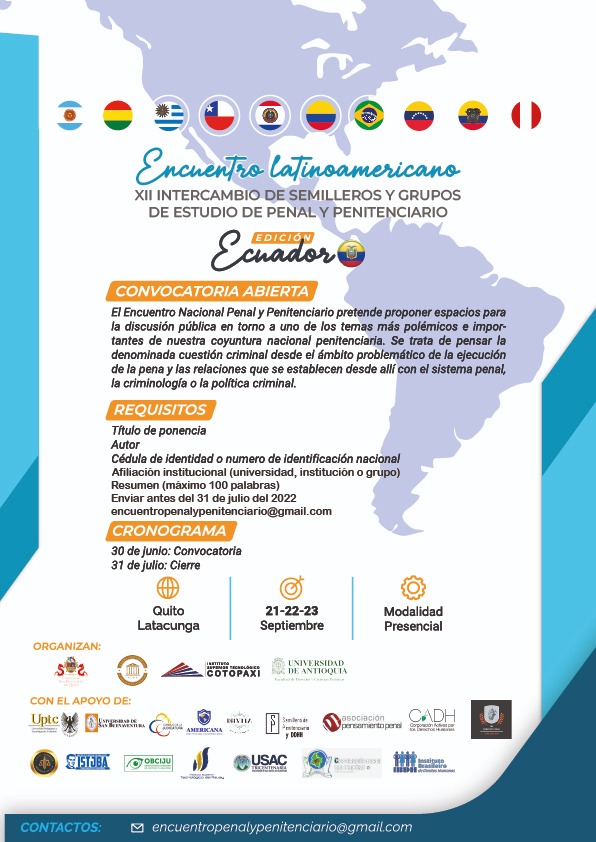 Los estudiantes de pregrado, especialización, maestría o doctorado, de diferentes áreas del conocimiento que se encuentren vinculados a semilleros, grupos de investigación, grupos de estudio o demás en los que se ocupen de temas referidos a la privación de la libertad, pueden inscribir sus ponencias antes del 31 de julio para ser presentadas de manera presencial este año entre el 21 y 23 de septiembre en Ecuador, (Quito y Latacunga)